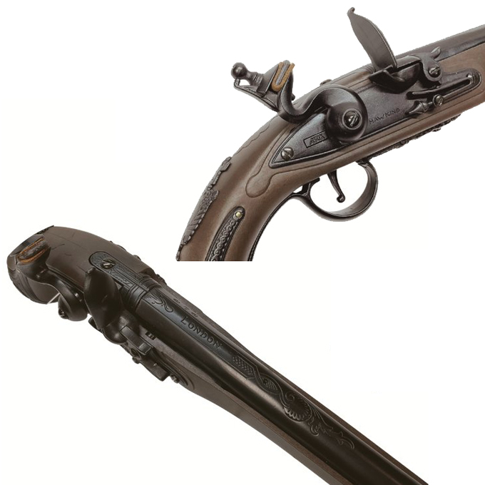 マズルローディングのフリントロック(火打ち式点火)式ピストルを再現した、エアーコッキングガンです。