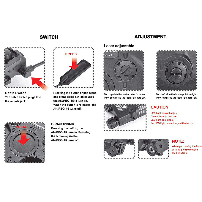 海外仕様はLEDライトとレッドレーザーポインターの複合モジュールですが、日本国内仕様はLEDライトのみが機能します。