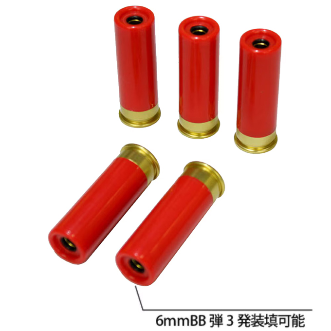 シェル一個に6mmBB弾を1〜3発装填し、チューブマガジンに5個のシェルを装填、レバー操作で機関部を動作させて装填・発射・排出を行う構造です。