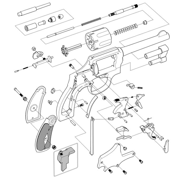 現在の「S&Wメカ」との大きな違いは、ハンマーリバウンドをコントロールするパーツがやや無理のある設計で、コイルスプリングではなくリーフスプリング(板バネ)によって動くレバーを備えています。