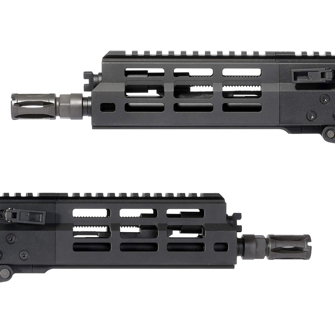 アルミニウム合金製のアッパーレシーバーとM-LOKハンドガード、MBTフォールディングストックを装備した構成となっています。