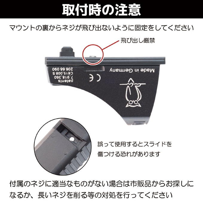 ※マウントを本体に取り付ける前に、ドットサイトをマウントに取り付けてみて、ネジが裏面に突き出していないか確認して下さい。