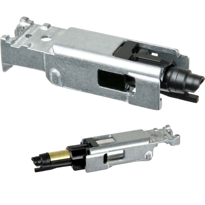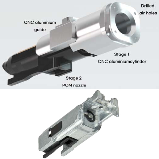 最大の特徴は中間部に伸縮パートを一段階追加してストロークを延長している事で、ピストンのボアアップ、気密の向上と合わせてスライドを最後まで力強く後退させる事が可能になります。