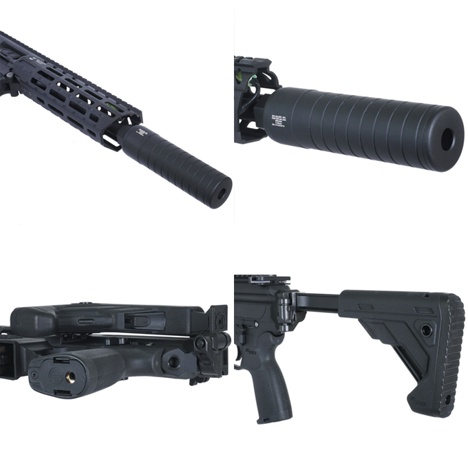 Midwestタイプ 8インチ M-LOKハンドガード、SIG SRDタイプダミーサプレッサー、SIGタイプの伸縮/折り畳み式ストックを装備したスタイルです。