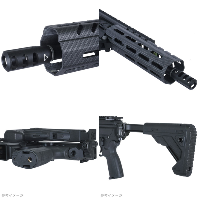 映画「ジョン・ウィック: Chapter 3 Parabellum」劇中モデルをイメージして、TTI LANCERタイプ 7.6インチ M-LOKハンドガード(カーボン調プリント仕上げ)、TTIタイプコンペンセイター、TTIタイプマグウェルとTTIタイプマガジンベースパッド、SIGタイプの伸縮/折り畳み式ストックを装備したスタイルです。