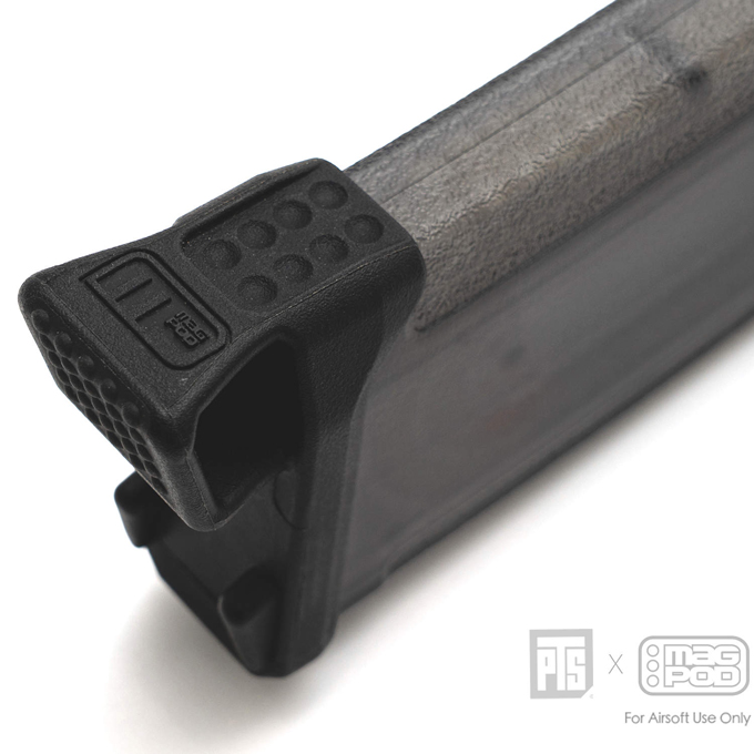 「MAGPOD」は、マガジンの底を地面に着けた状態で銃を水平に保持するモノポッドとして機能します。 また、マガジン交換の際に指先でつまむのに都合の良い形状となっています。