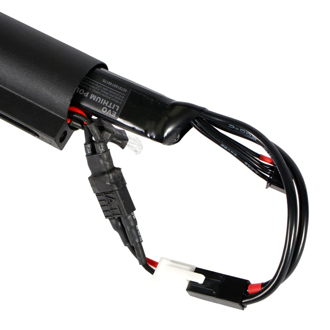通電抵抗の低い配線材とコネクターを採用し、部材全てをブラックカラーに統一することで銃の隙間からバッテリー見えても目立たないのも魅力です。