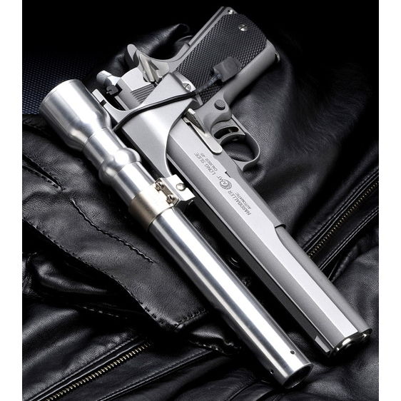AMT社のステンレス製・ロングバレル&スライドM1911クローンモデルの、ハードボーラーを再現したモデルガンです。