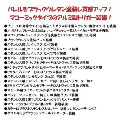 スプリングガイド、スプリング、バレルリンク、チャンバーカバー、マガジンは発火後にサビが発生しないステンレス素材を使用、マグウェル、グリップセフティ、フロント&リアサイト、ハンマーはロストワックス製法によるスチール系素材、サムセフティも同製法によるステンレス系素材を使用しています。