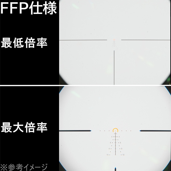 レンズの動作方式は、第一焦点面(FFP:First Focal Plane)が採用されており、倍率を変更するとレティクルのサイズが変化する点が特徴です。