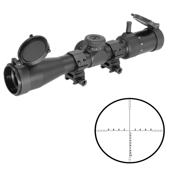 一般的な約20mm幅ピカティニー規格レールマウントに対応したマウントリング、銃に取り付けた状態でレンズを保護するフリップアップキャップが付属します。