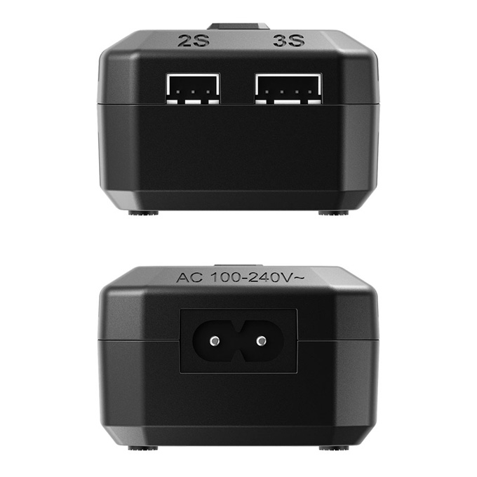 電源は家庭用100-240V 50/60Hzに対応、バッテリー側はJST-XHバランス充電コネクター(2C/3C)に対応します。