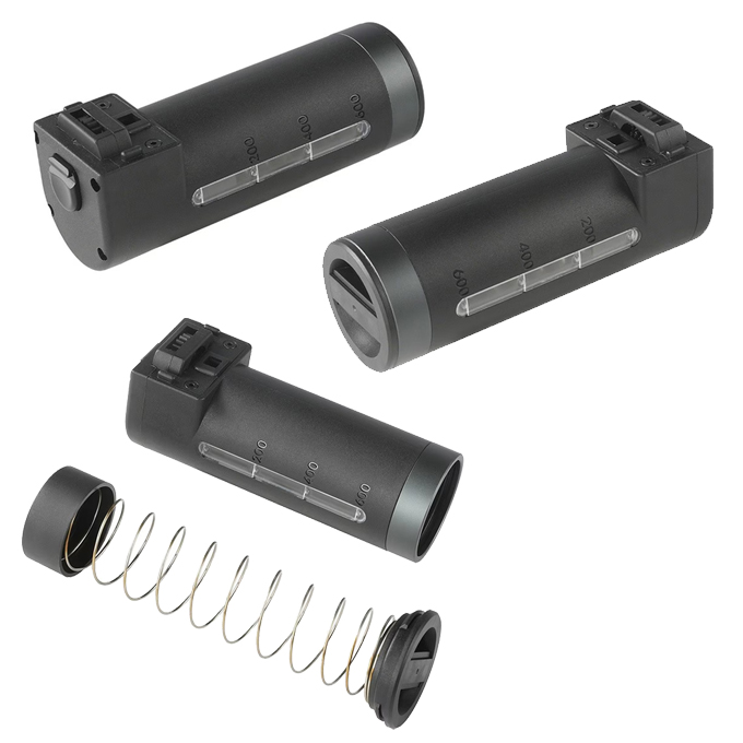 円筒型の専用マガジンの装弾数は1200発となっており、本体側の動力で給弾用のゼンマイが自動的に巻き上げられます。