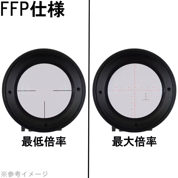 最大の特徴であるレティクルの表示方式、第一焦点面(FFP:First Focal Plane)を採用、倍率を変更するとレティクルのサイズも一緒に変化し、倍率を上げていけばレティクルが拡大される方式となります。