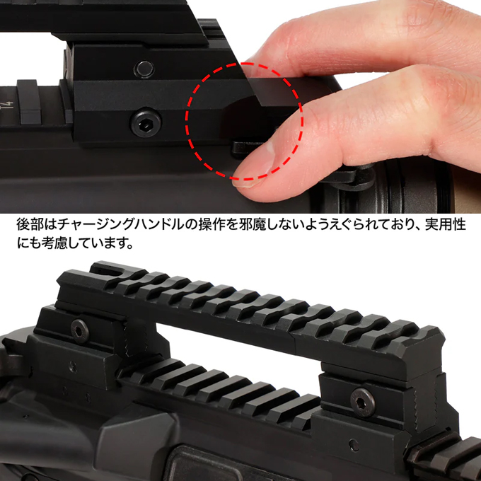 中レールを抜いた状態でM4系の銃に取付けるとアッパーレシーバー上に綺麗に収まり、後部の形状はチャージングハンドルの操作を邪魔しません。