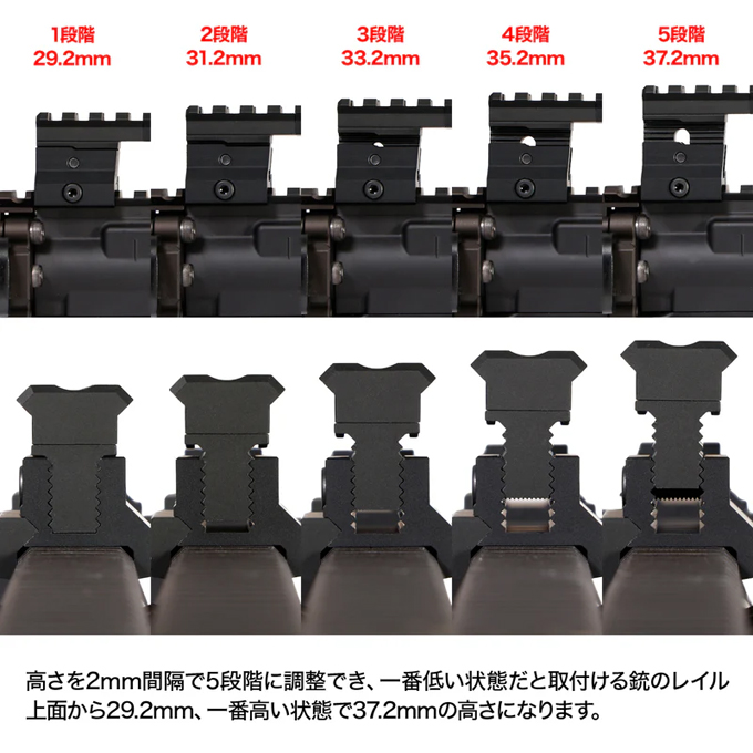 高さは2mm間隔で5段階に調整でき、一番低い状態だと取付ける銃のレイル上面から29.2mm、一番高い状態で37.2mmの高さになります。