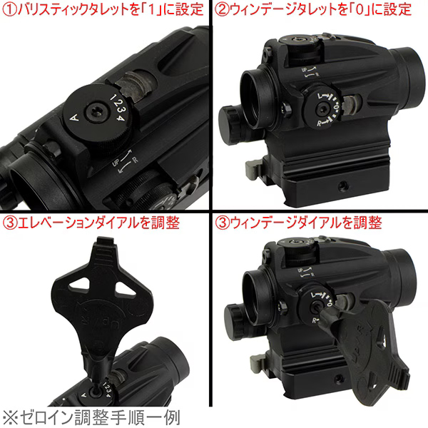 基本的なゼロイン調整方法は、使用したい調整リングを取り付けた後、エレベーション(上下)とヴィンテージ(左右)ともにダイアル中央の調整ネジでゼロインを行います。