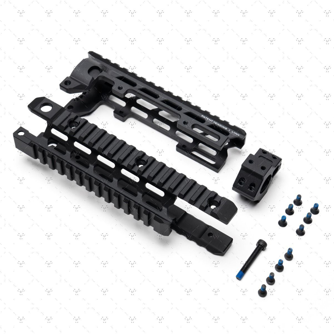 フロントサイト部に固定用のブロックを取り付け、後部のデルタリング(スリップリング)と合わせてハンドガードを固定します。