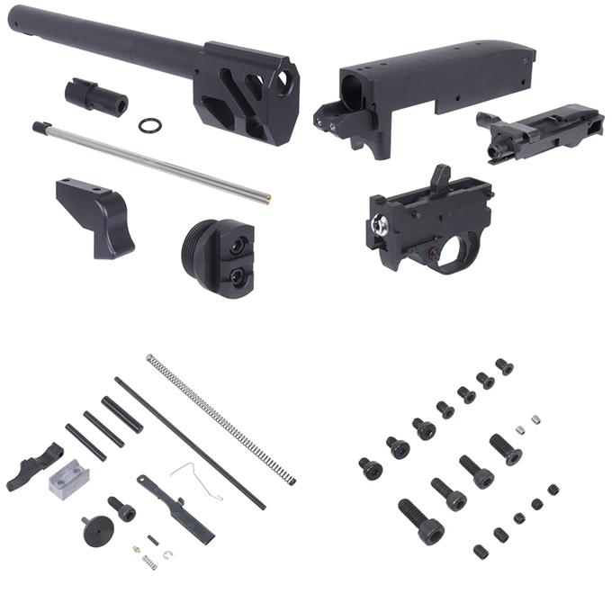 DXタイプは、KJワークス純正の機関部が付属しており、本キットの他にマガジン、実銃もしくはガスブローバックガンAR15用グリップ、リアルピッチのAR15カービン用バッファーチューブ、もしくはピカティニー規格レール対応ストックが必要になります。
