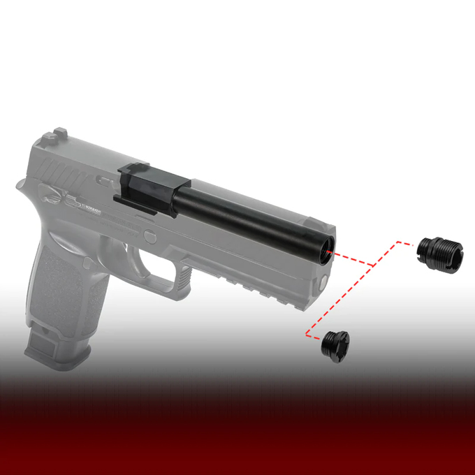 このパーツは、可動ギミックを省略してその負担を低減、さらに先端部内側に11mm正ネジを切ってあり、付属の14mm逆ネジアダプターの使用によりサプレッサーやトレーサーデバイスなどを装着した場合にブローバック動作の妨げになりにくくなっています。