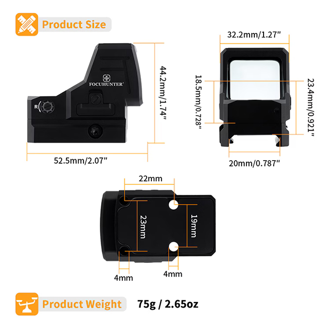 ・製品サイズ(ピカティニーベース含む):52.5×32.2×44.6mm