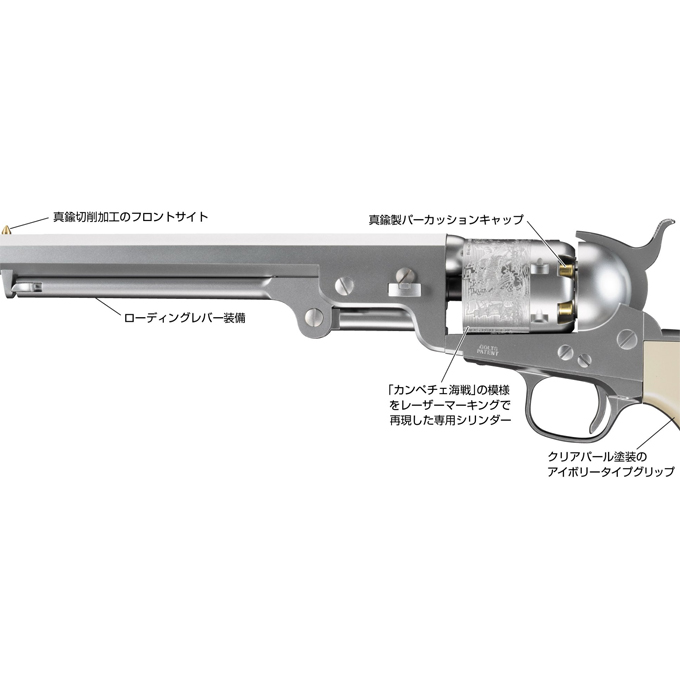グリップはアイボリー(象牙)調クリアパール塗装仕上げ、シリンダー後部の雷管(パーカッションキャップ)とフロントサイトは真鍮製と、雰囲気にもこだわっています。