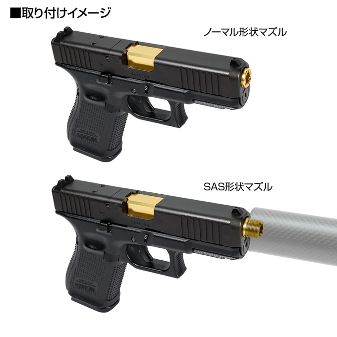 先端部に11mm内ネジが切られており、付属のマズルキャップと14mm逆ネジサイレンサーアタッチメントを交換する事で二通りの使い方が可能です。