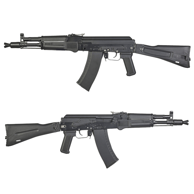 AK74の短縮モデルであるAKS74Uがサブマシンガンクラスを志向しているのに対して、フルサイズから約10cm短いバレルとそれに関係するマズルデバイスとガスシリンダー部、フルサイズのストック、強化樹脂製のインターフェイスが特徴のモデルです。