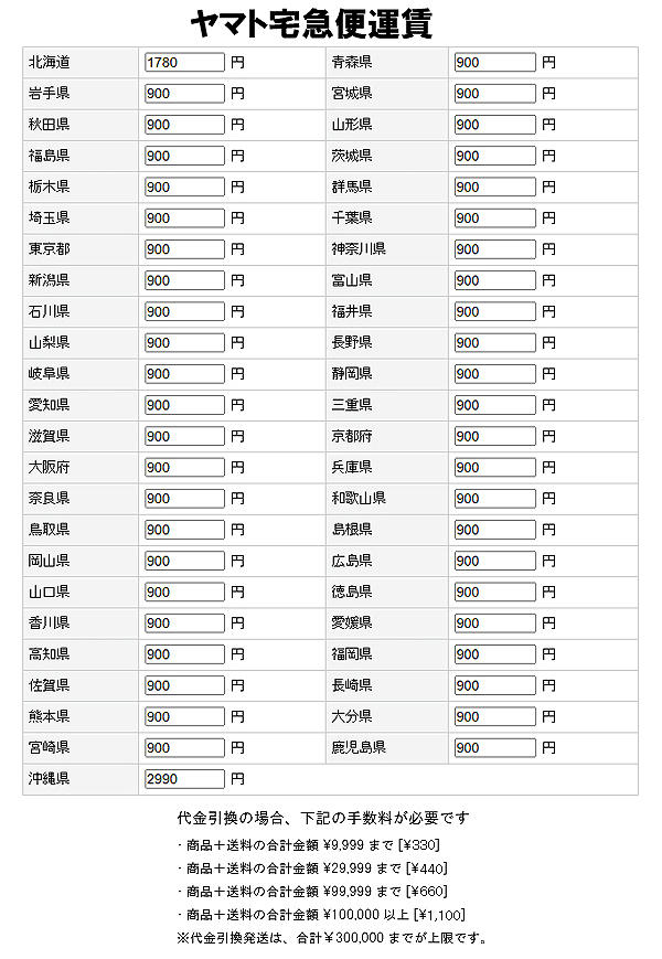 ・縦+横+高さの合計が160cm以内 ・重量25㎏以内 *1個口ごとに送料が発生します。 注)個分け不可(一個の商品でサイズオーバー)で宅急便サイズを超えた場合はヤマト便での発送となります。 料金は下記ヤマト運輸のページをご参照ください。 http://www.kuronekoyamato.co.jp/ytc/search/yamatobin/yamatobin_ryokin/ ◆ヤマト宅急便運賃◆